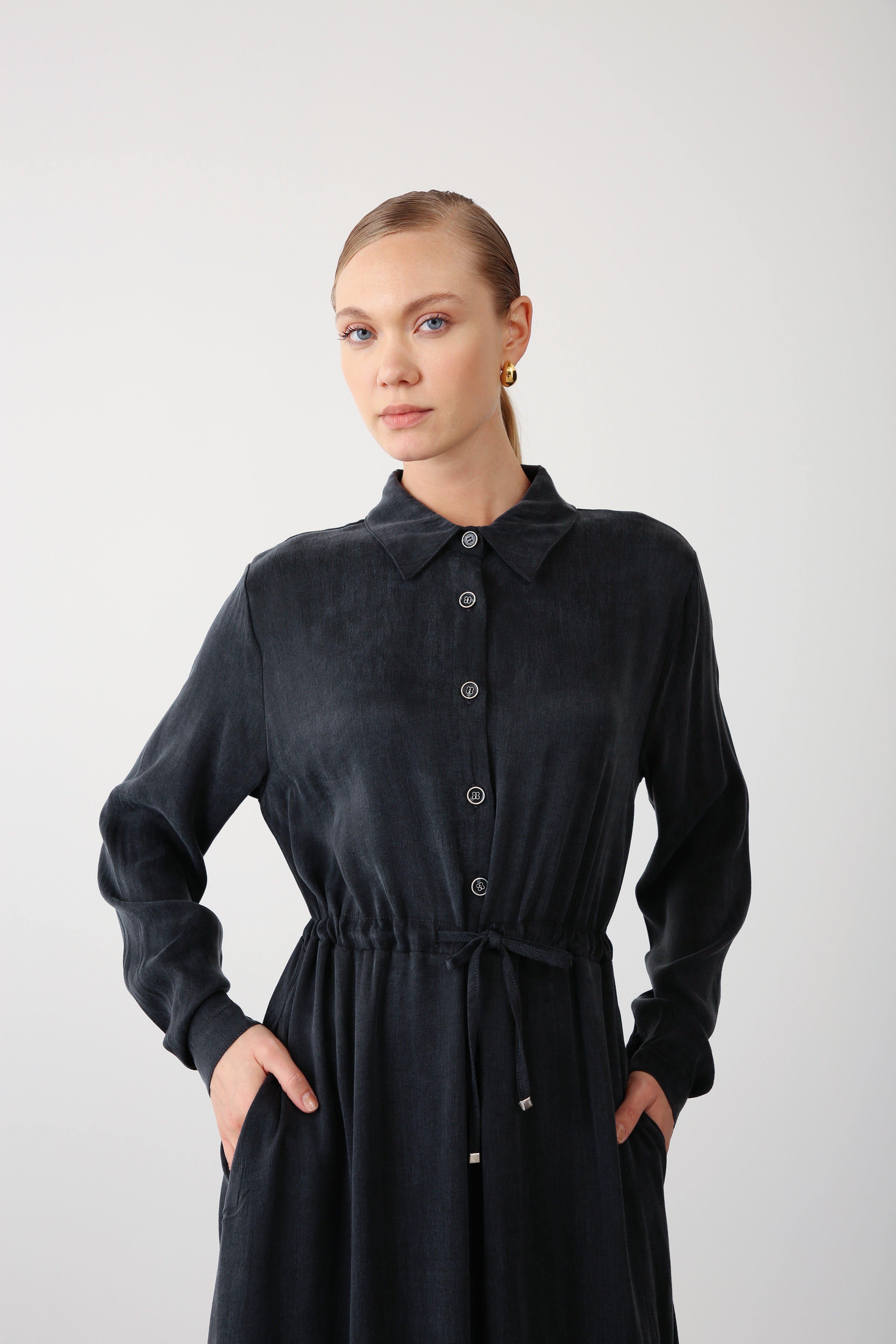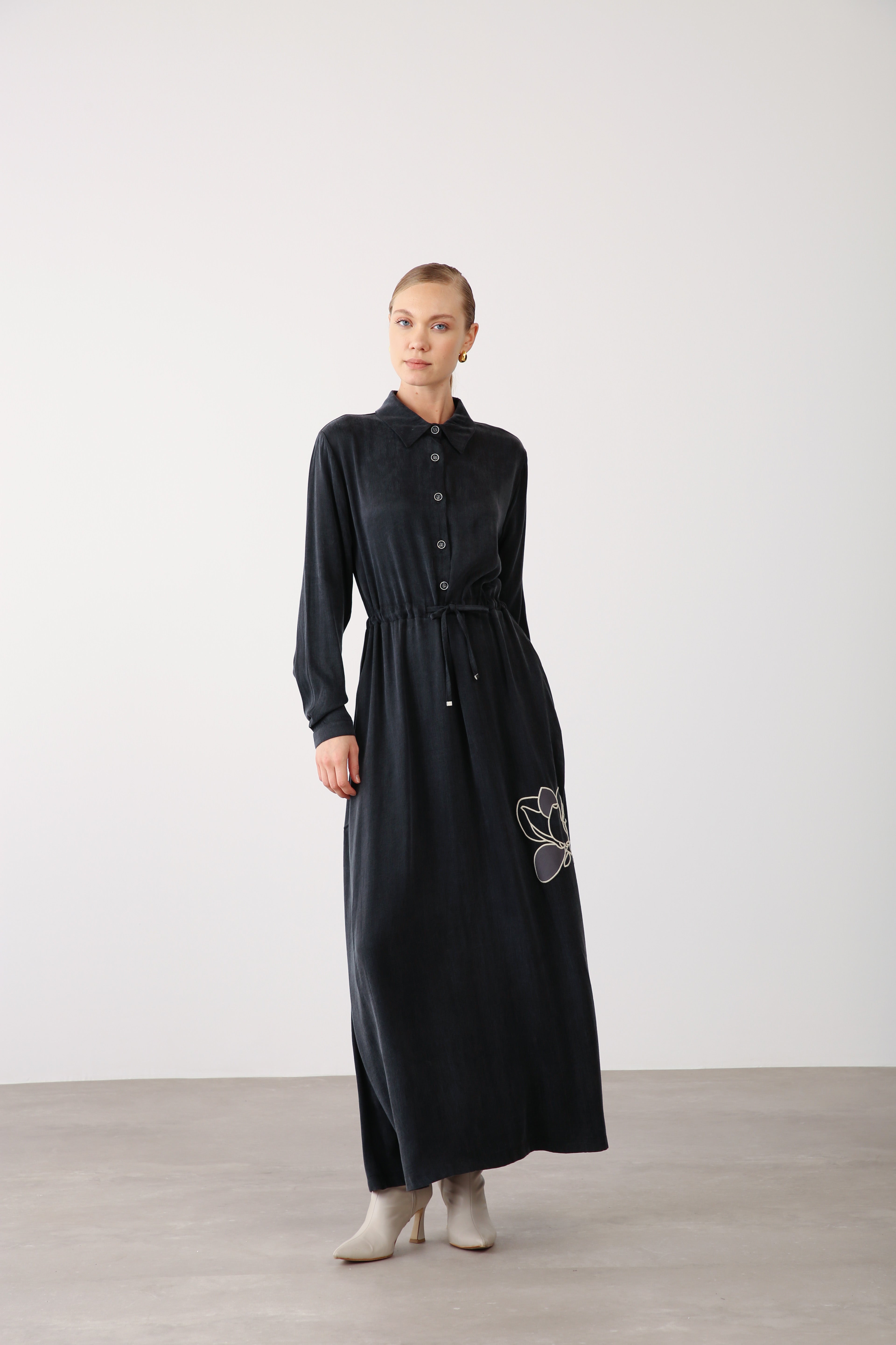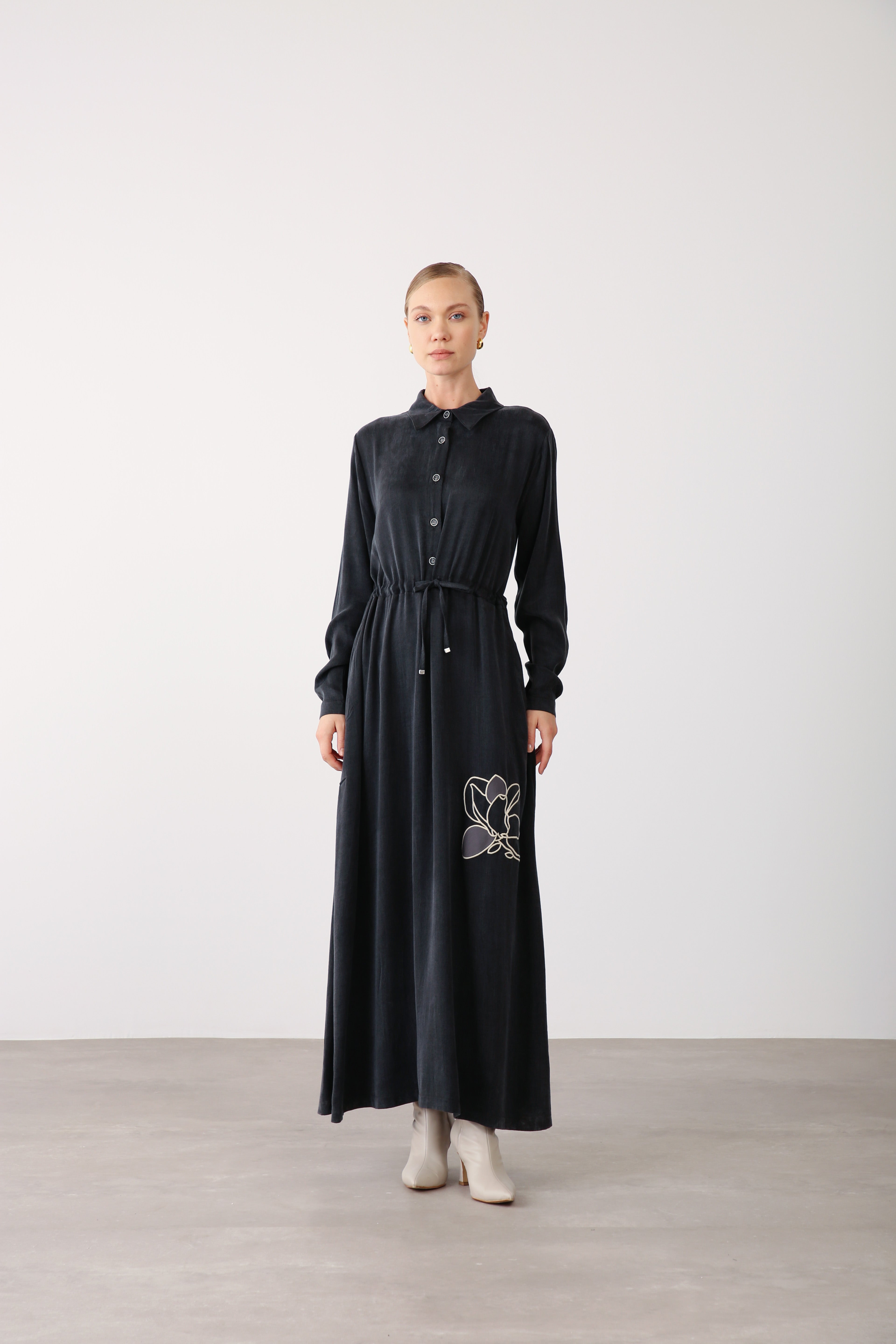 This black dress redefines classic elegance with its subtle floral embroidery and button-down details. The adjustable waist drawstring shapes the silhouette gracefully, offering comfort without sacrificing style. Designed in sizes 1, 2, and 3, it ensures a flattering fit across different body types.