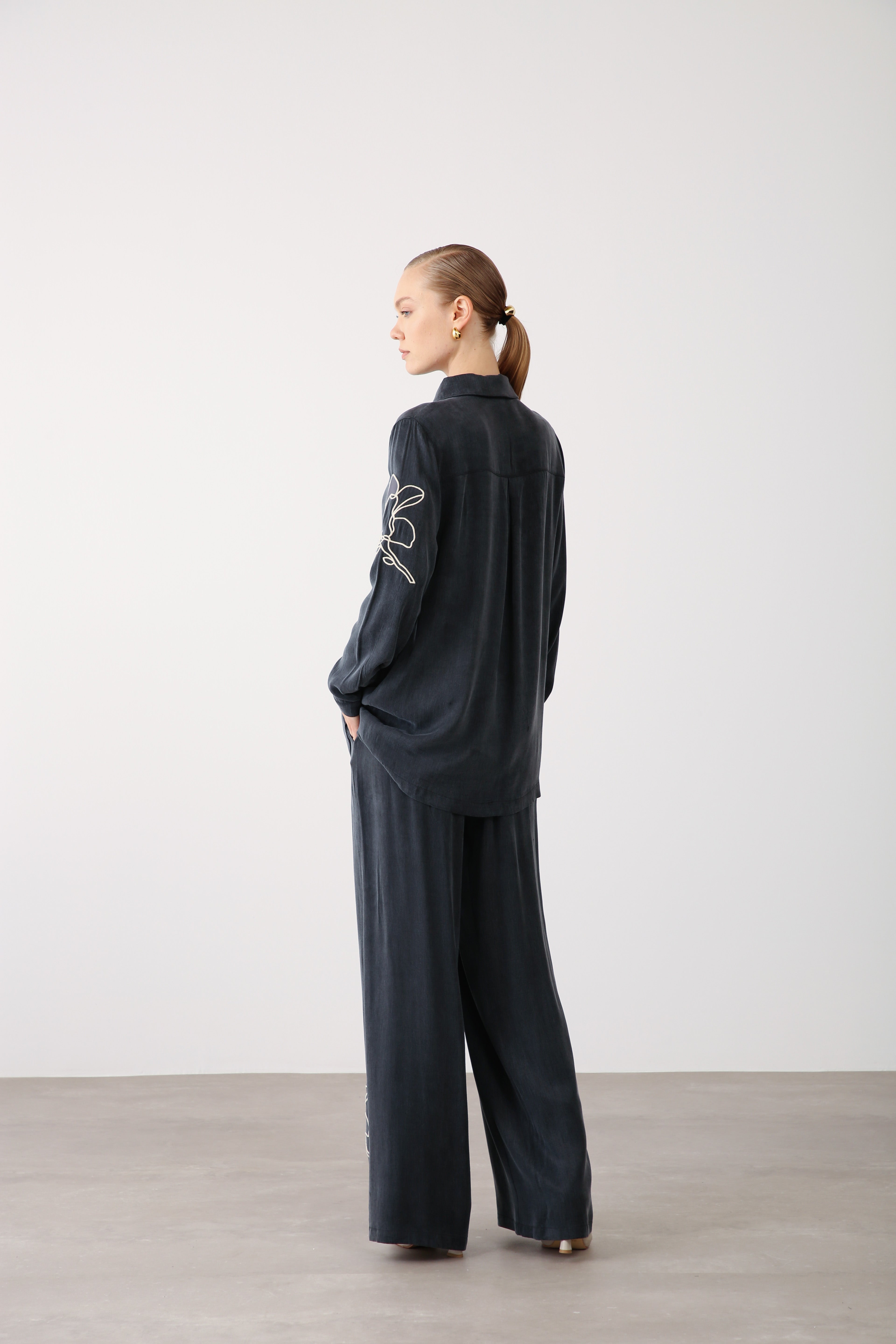Defined by embroidered hems, these pants bring a refined touch to a relaxed silhouette. The wide legs flow gracefully, while the drawstring waist ensures both comfort and adjustability for everyday wear.