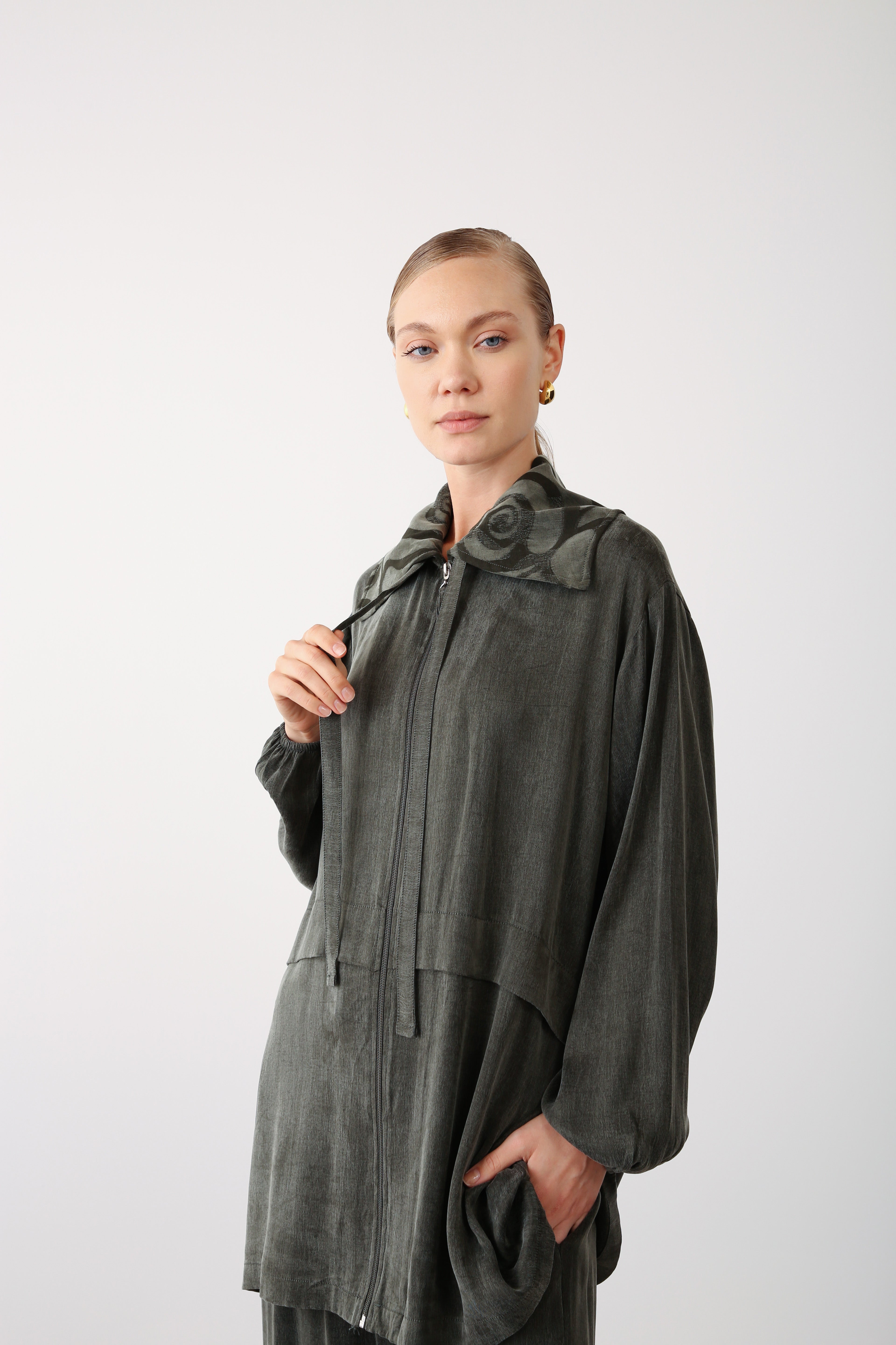 This two-piece set in khaki tones pairs a patterned collar zippered jacket with wide-leg pants, delivering a refined balance of elegance and practicality. The jacket features a patterned collar and elastic cuffs for comfort, while the pants are tailored with a flowing silhouette and elastic waistband for effortless wear.