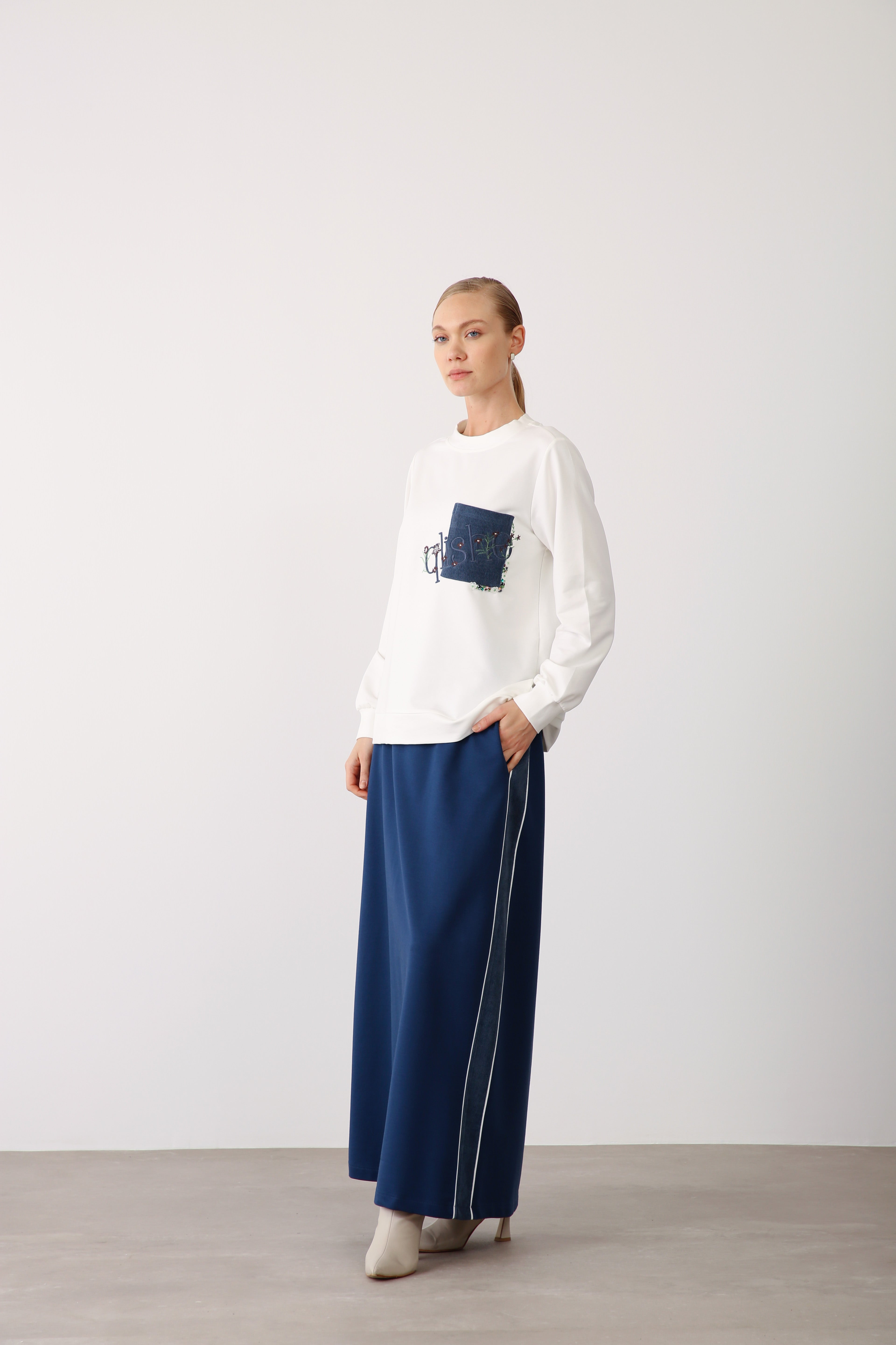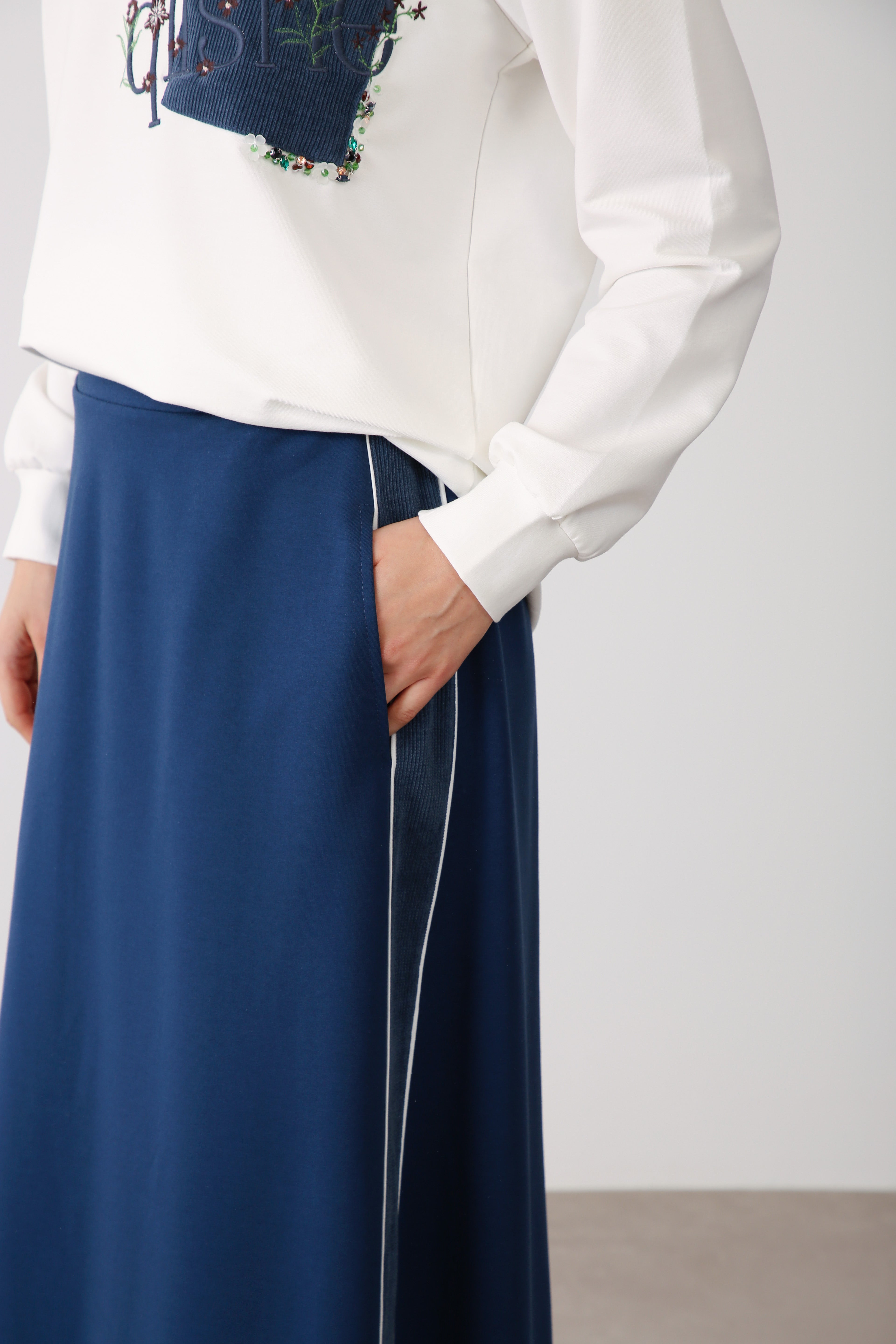 Designed with a minimalist silhouette, this skirt stands out with its refined side stripe detail that elongates the form and adds a modern edge. The elastic waistband ensures day-long comfort while offering a flattering fit, making it a versatile piece that can be styled both casually and elegantly.