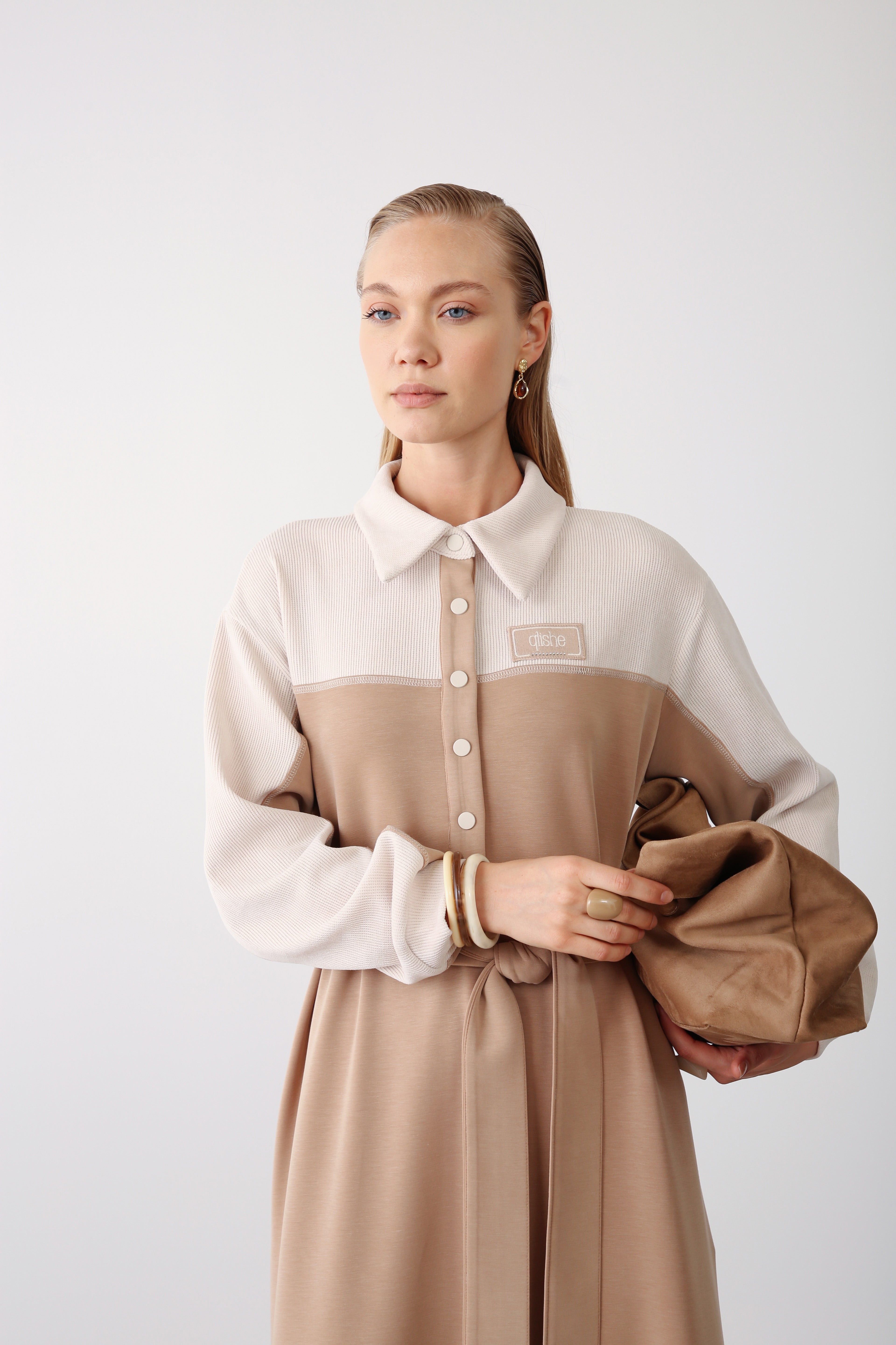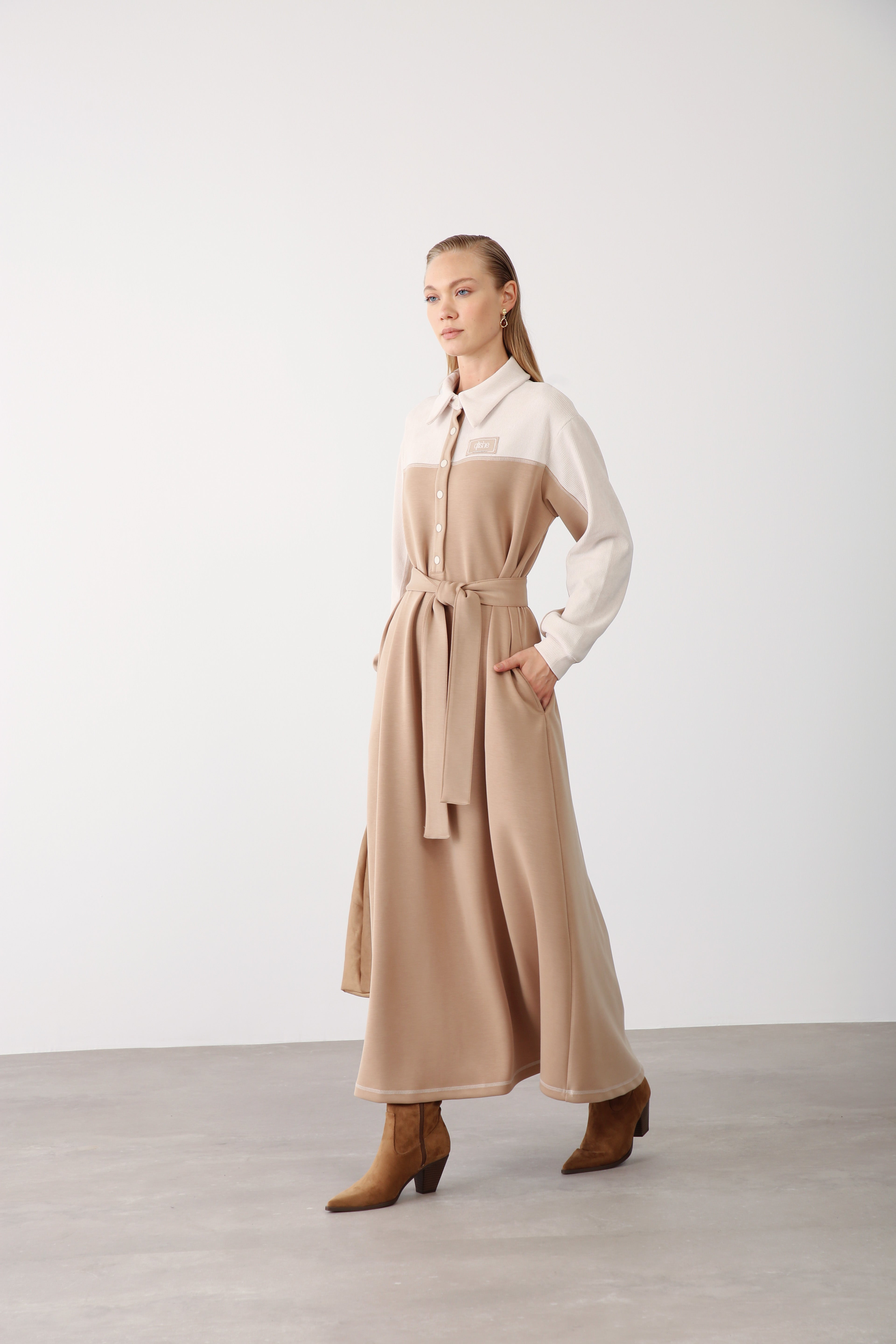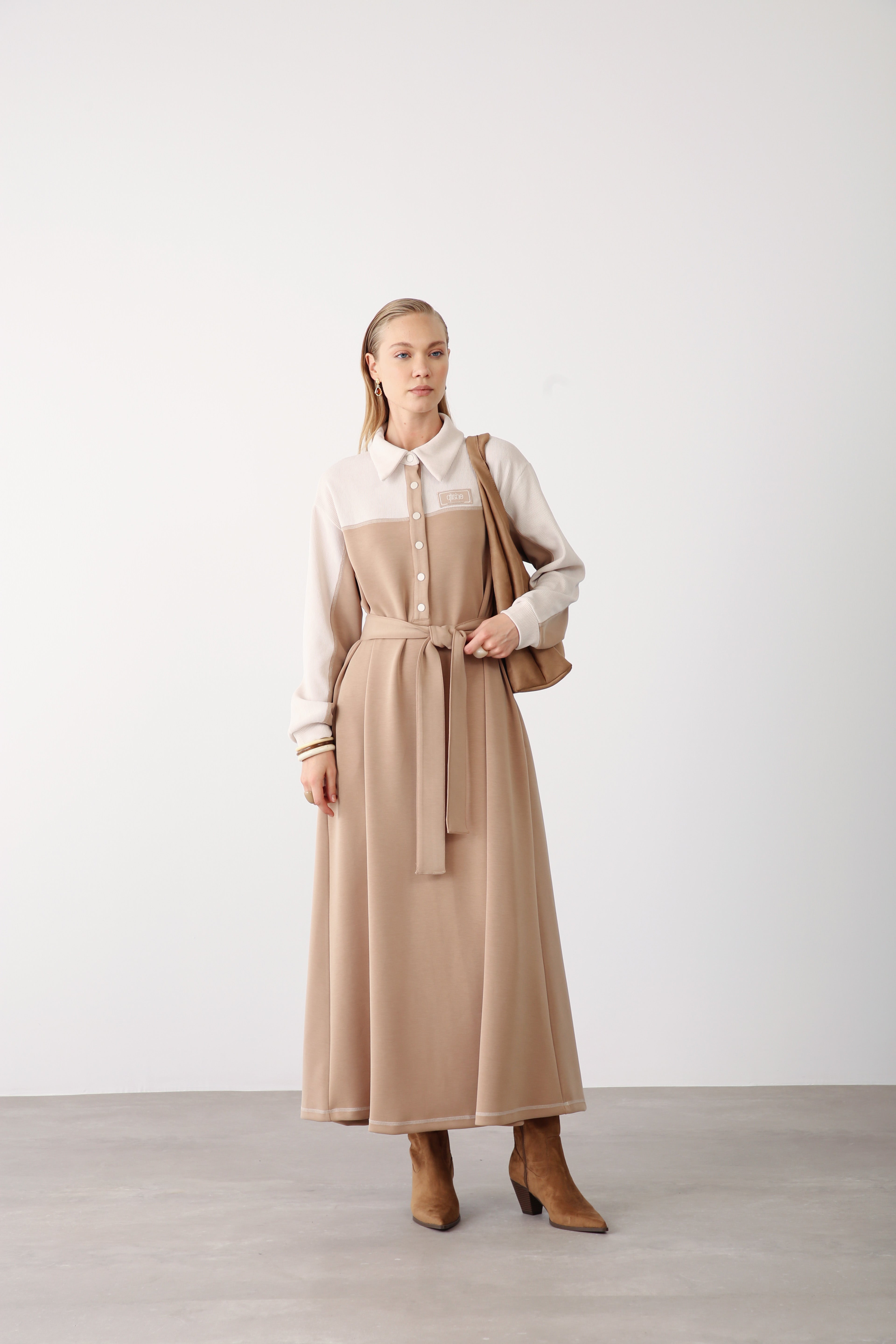 In warm camel tones, this dress blends understated elegance with modern functionality. The contrast details add depth to the design, while the belted waist and button-down style provide a flattering fit. Long sleeves and midi length make it ideal for both day-to-day wear and refined occasions.
