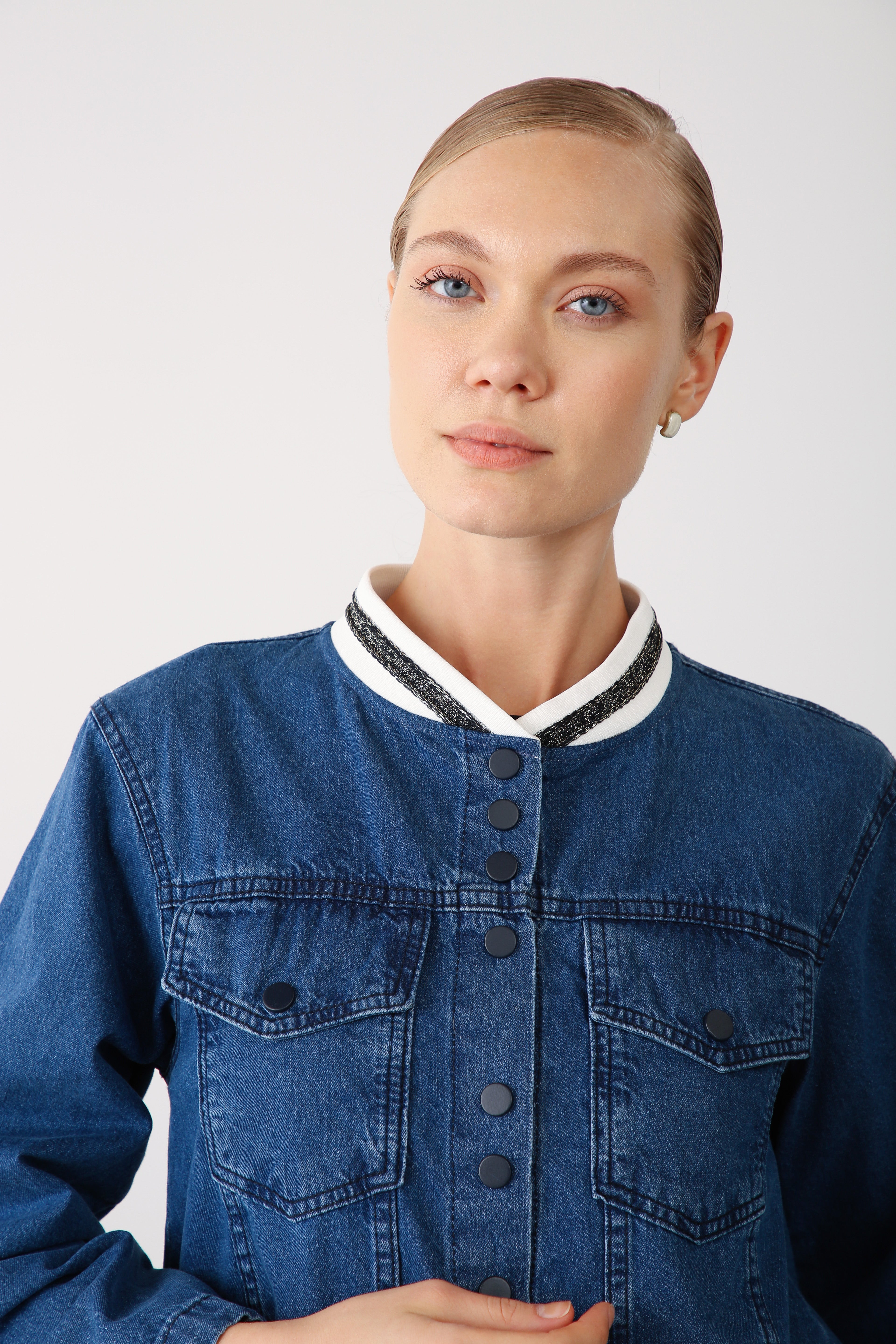 A denim jacket designed for modern city life. The navy snap fastenings offer a subtle yet striking detail, while the elastic hem adapts to the body, adding both comfort and a flattering shape.