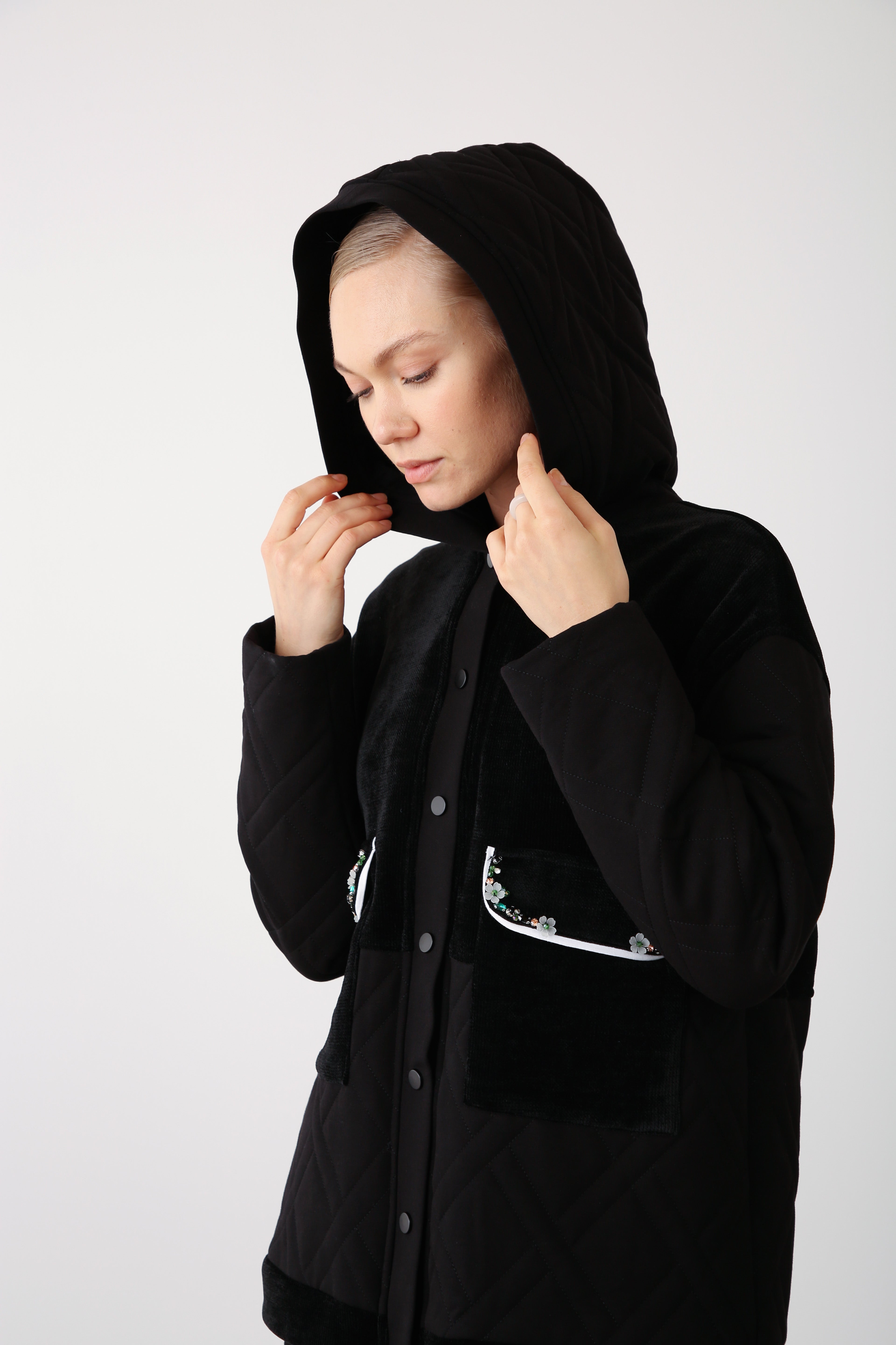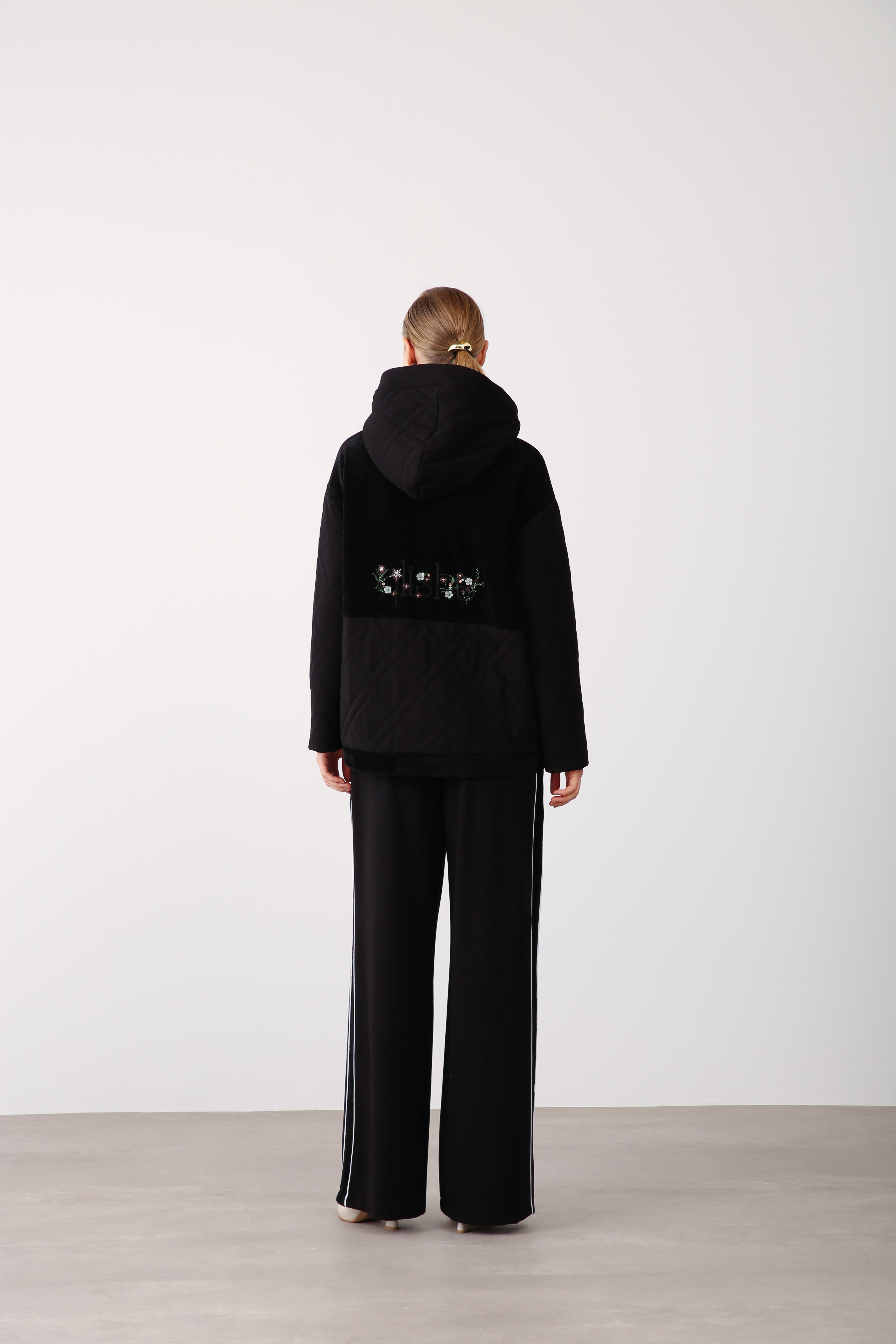 This black jacket stands out with pocket flaps enriched by floral bead embroidery, blending elegance with everyday functionality. Its hooded silhouette and seven snap buttons make it as practical as it is refined, creating a piece that balances subtle detail with versatile wear.