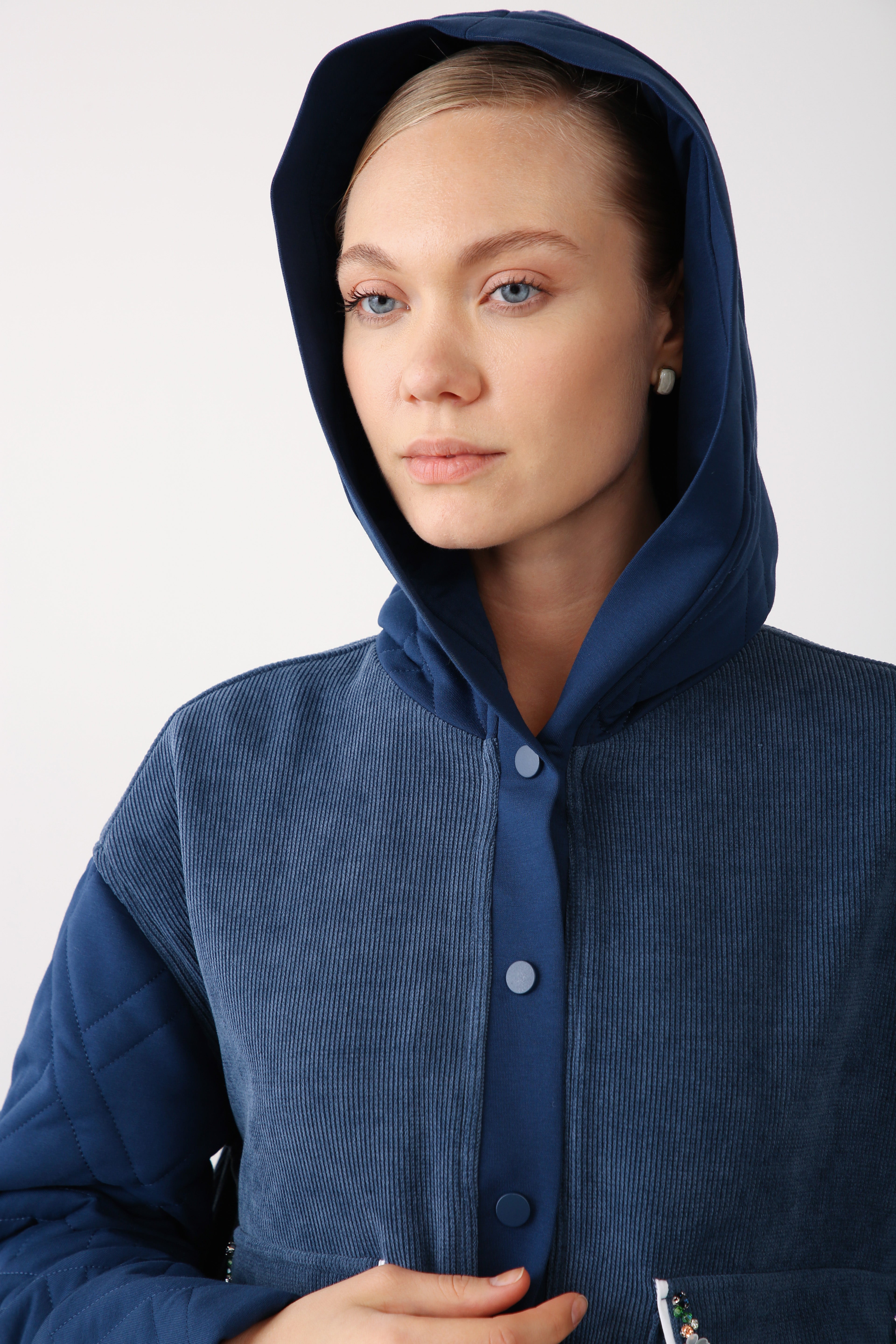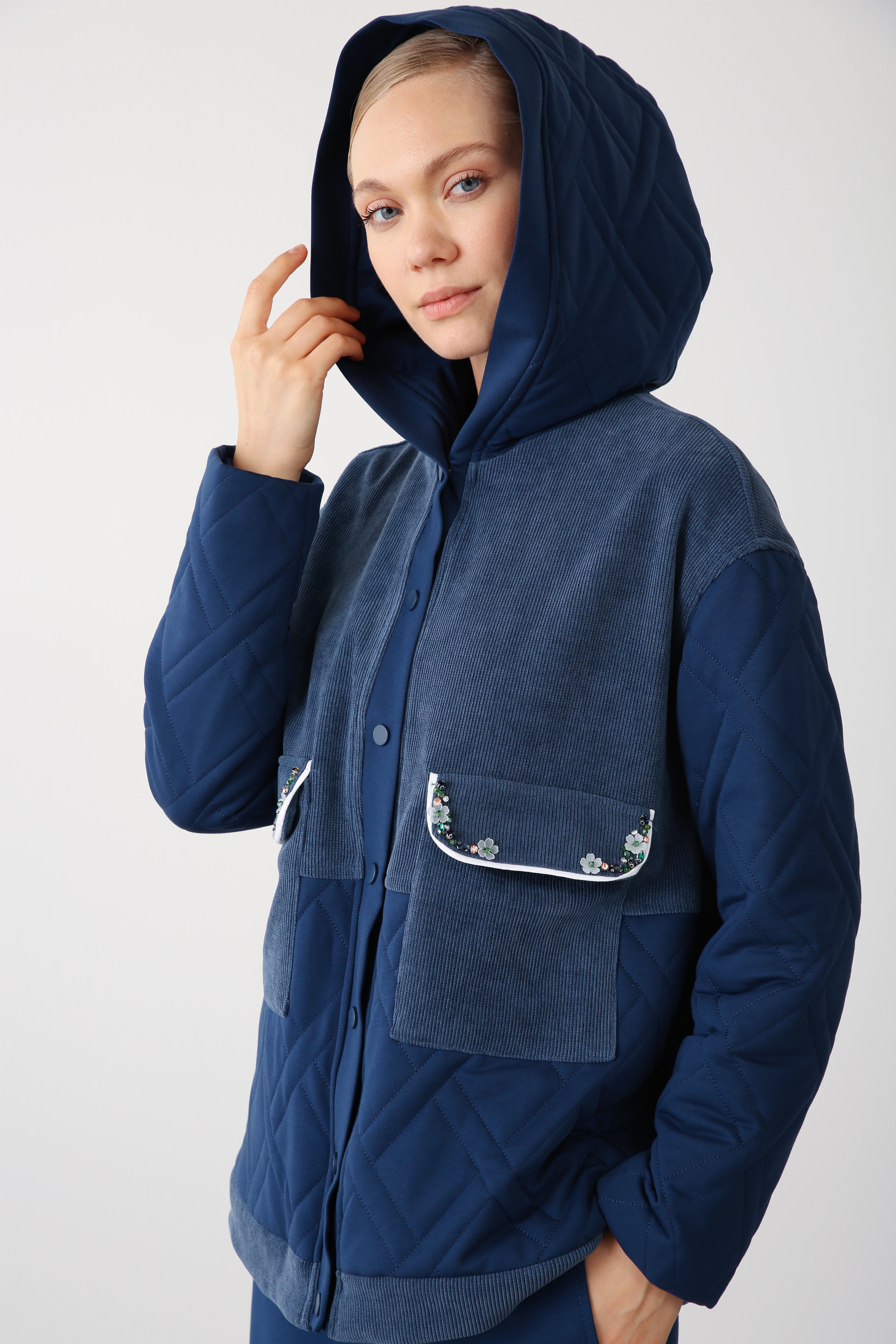 This indigo jacket captures attention with its hooded silhouette and pocket flaps adorned with delicate floral bead embroidery. The intricate detail adds a handcrafted charm that elevates the design beyond everyday wear, while seven snap buttons along the front ensure effortless practicality.