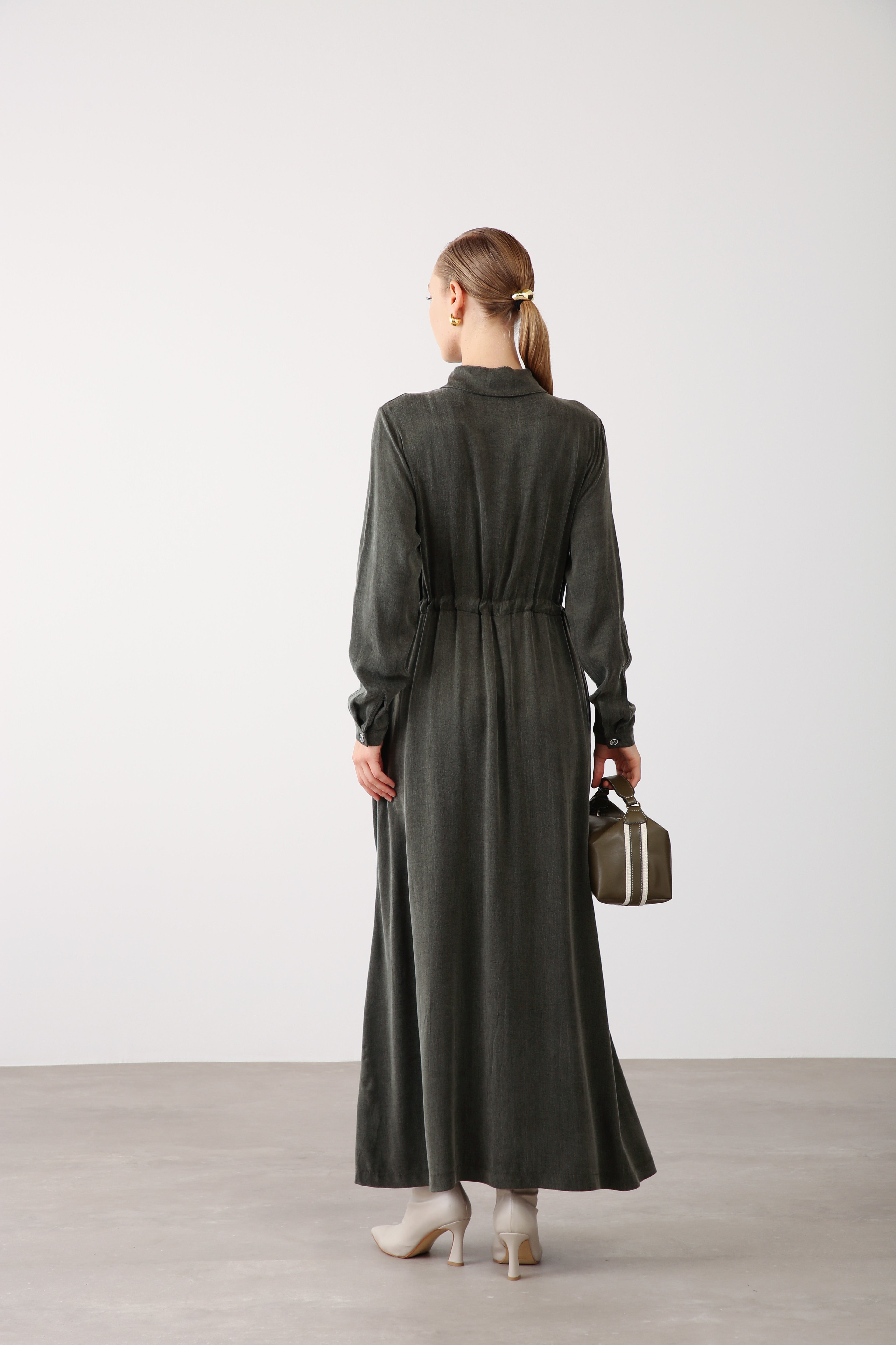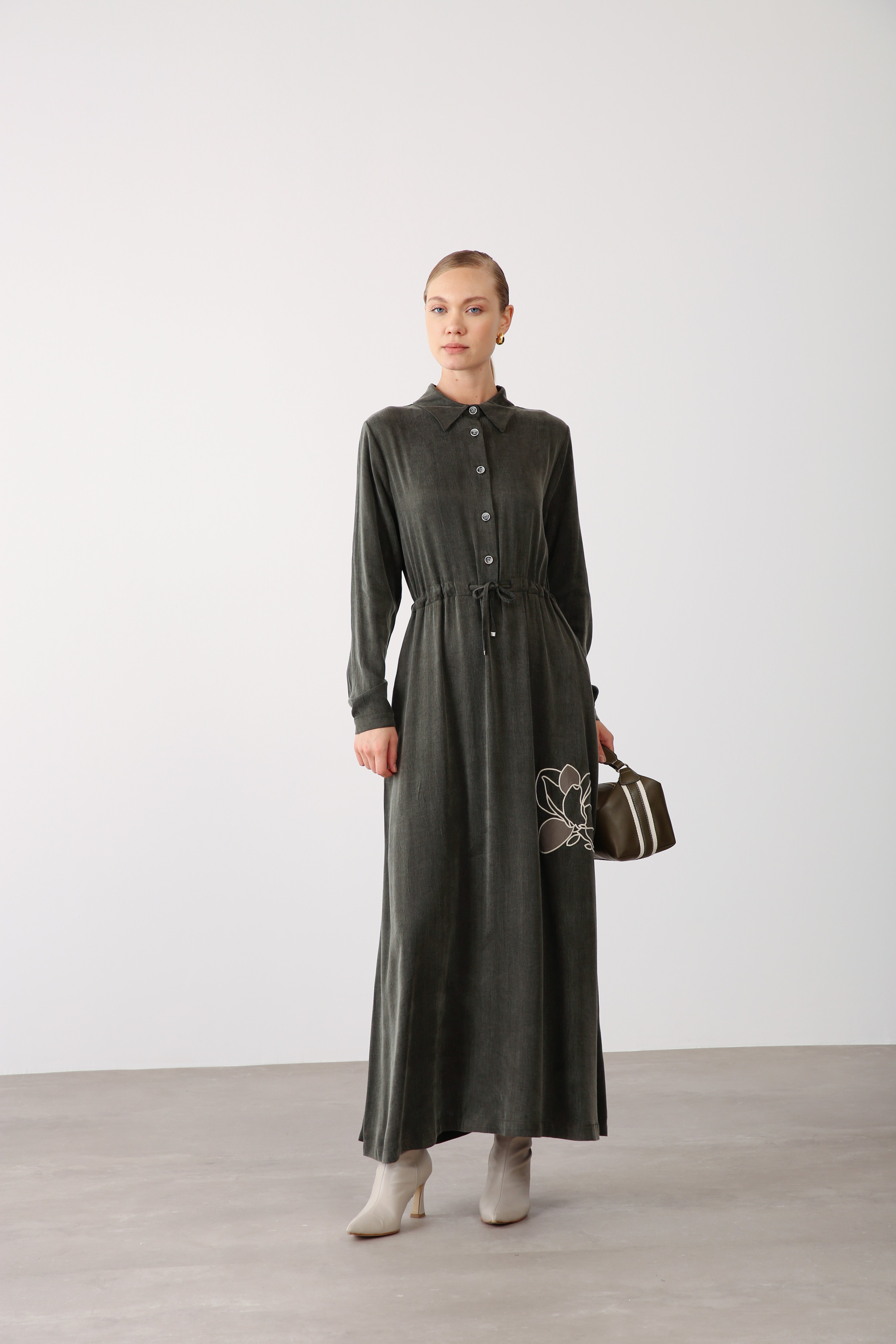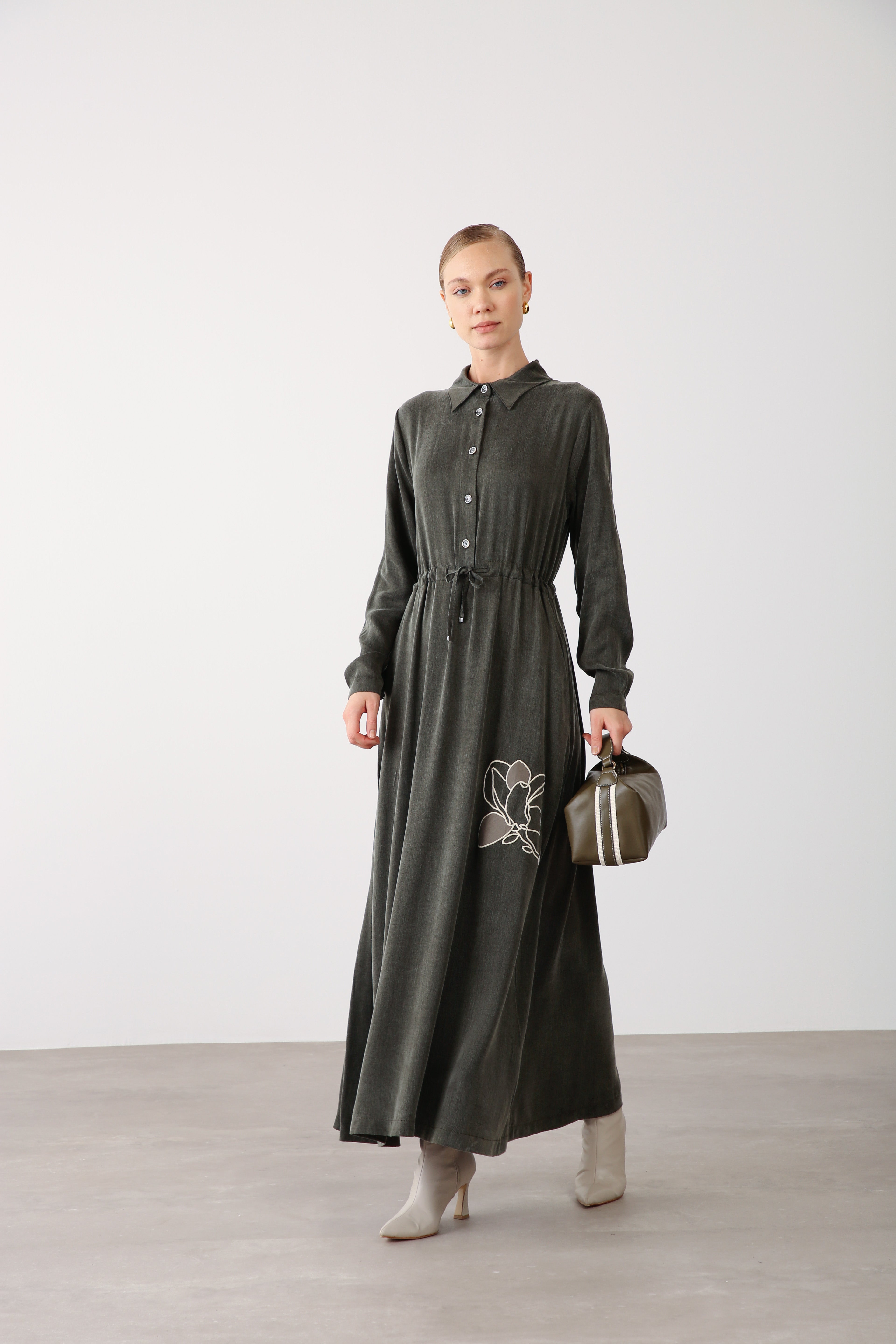 This dress stands out with its delicate floral embroidery and button-down design. The adjustable drawstring at the waist adds both comfort and a refined silhouette, making it an ideal choice for effortless elegance. Available in sizes 1, 2, and 3, it adapts beautifully to different body types.