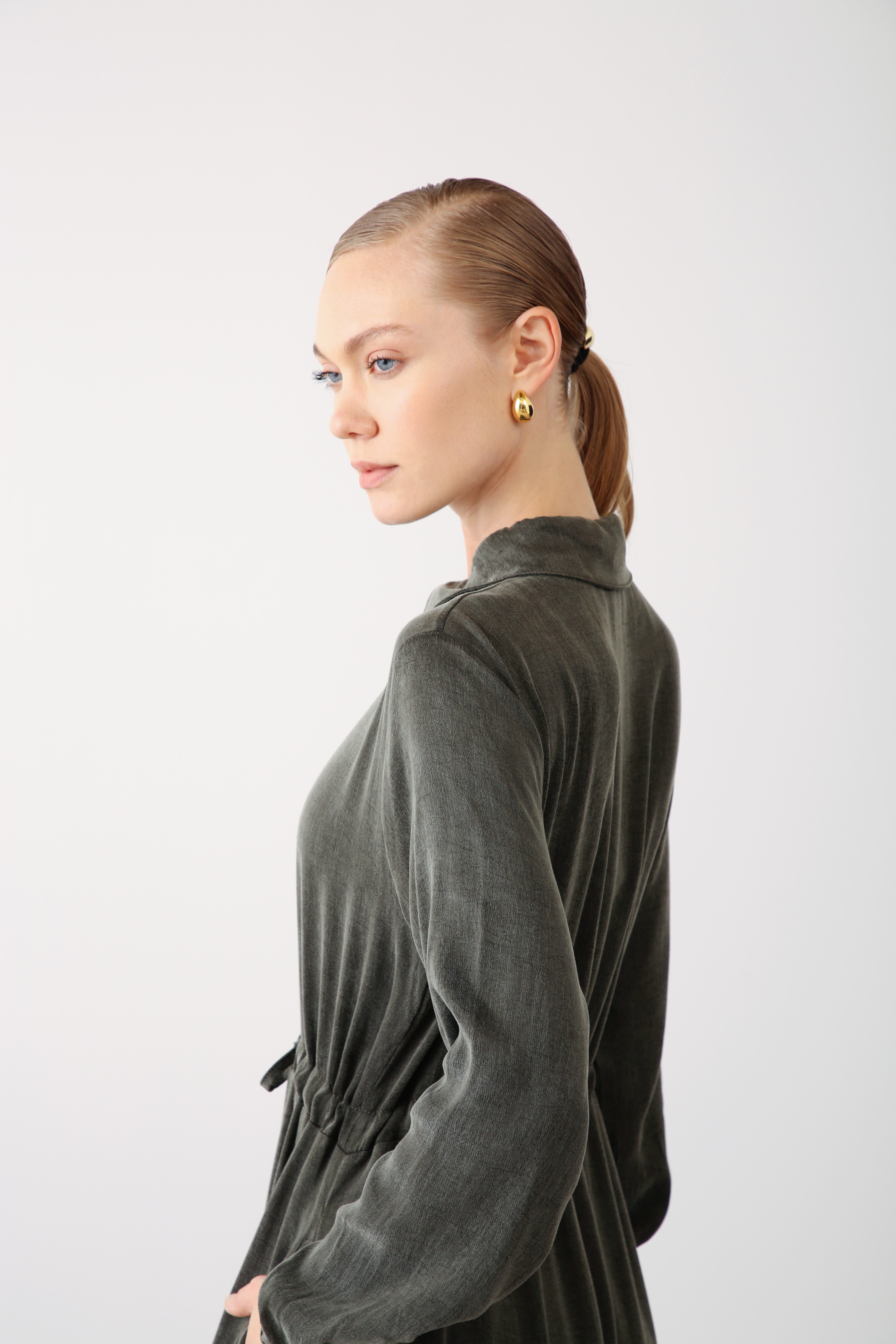 The flowing skirt enhances every step with grace, while the long sleeves combine sophistication with practicality. Perfect for special occasions or an understated yet captivating day look, it blends romance with timeless style.