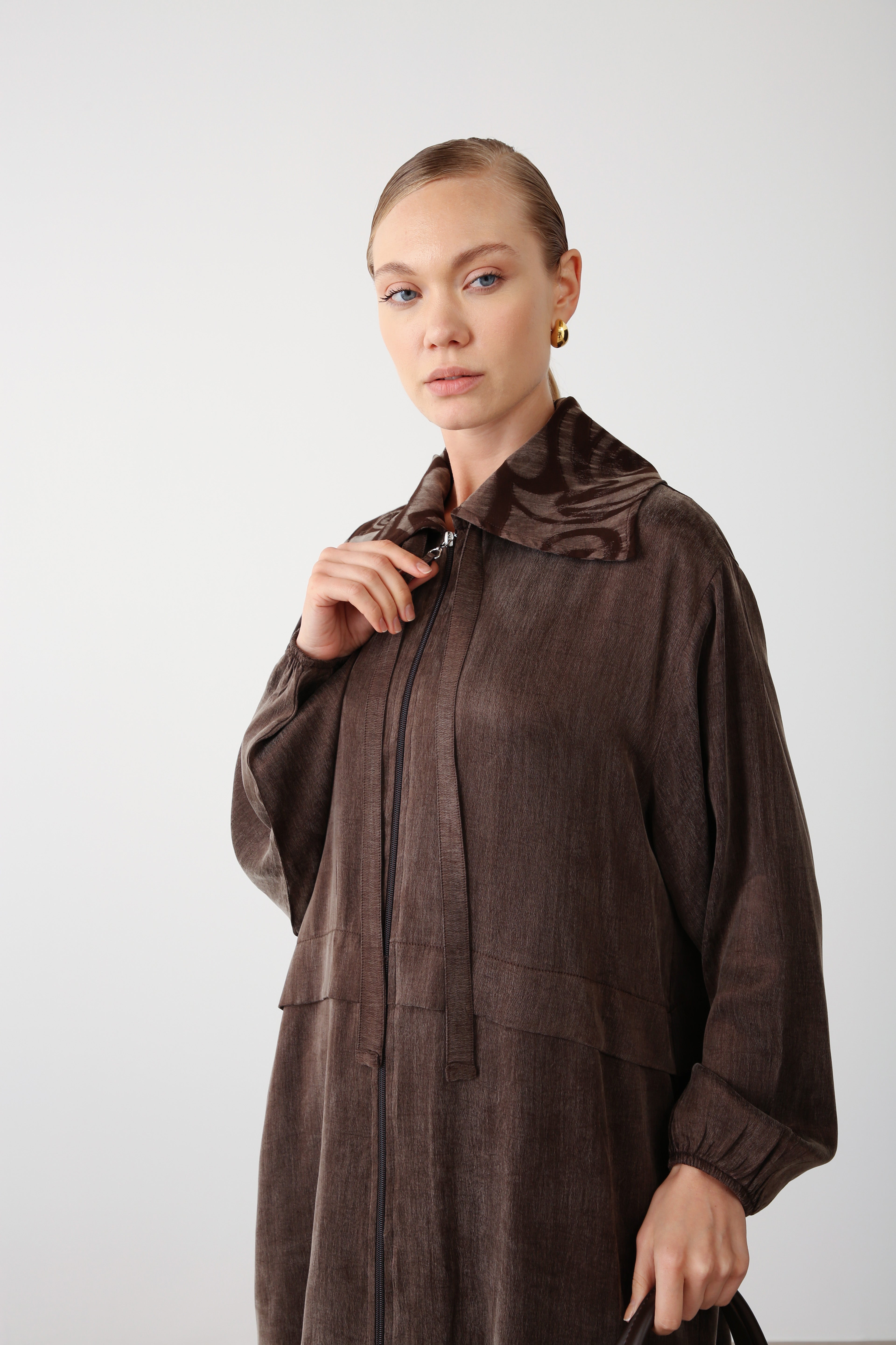 This jacket is elevated by its patterned collar detail, adding a unique accent to a timeless design. The zip closure enhances practicality, while the brown shade lends natural warmth to everyday styling.