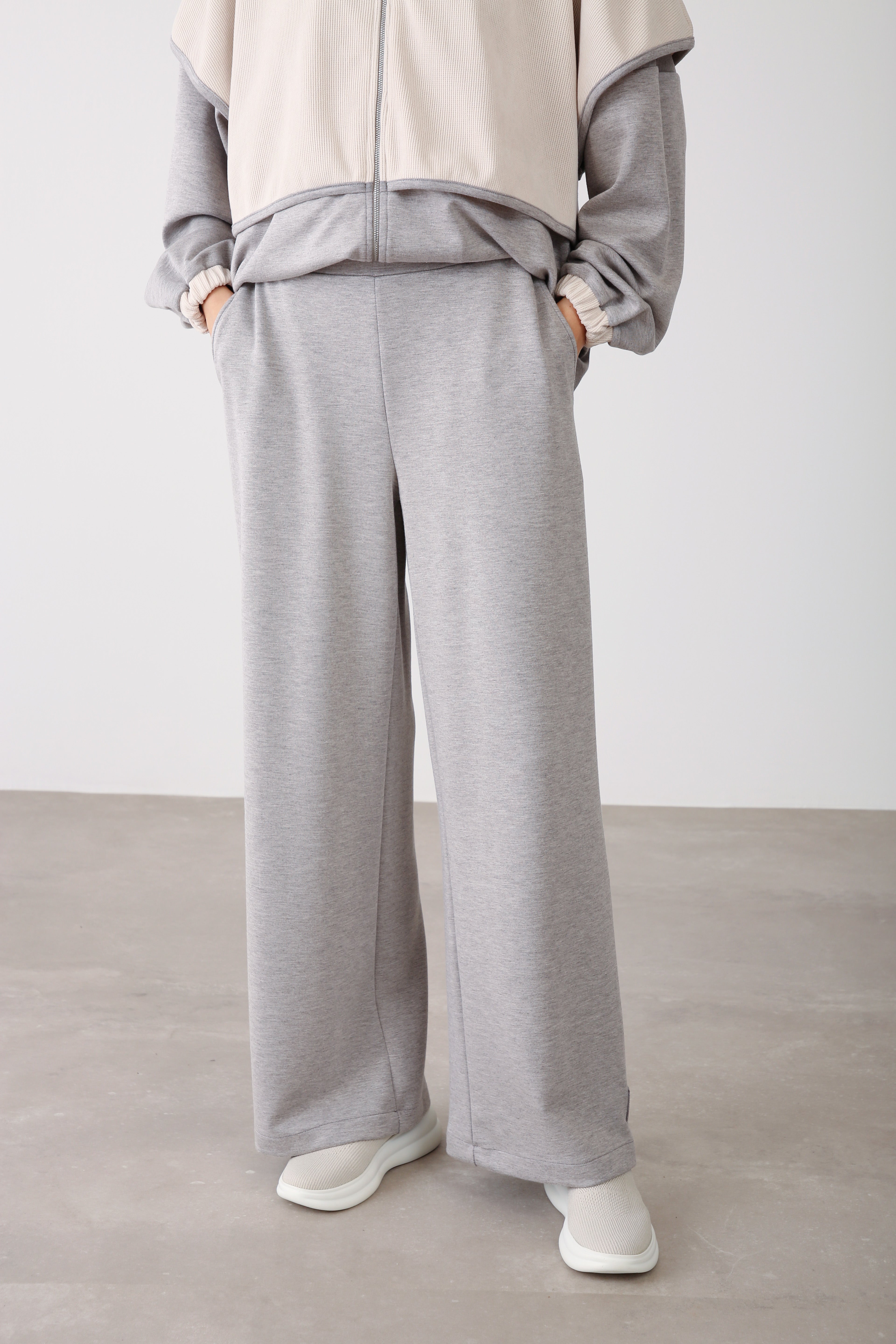 Zarif gri karışımından oluşan bu iki parçalı set, kapüşonlu fermuarlı ceketi geniş paça pantolonla birleştirerek rahatlık ve zarafetin dengeli bir görünümünü sunuyor. Yumuşak, nötr tonu modern karakterini vurgulayarak her duruma uyum sağlayabilecek bir seçim sunuyor.